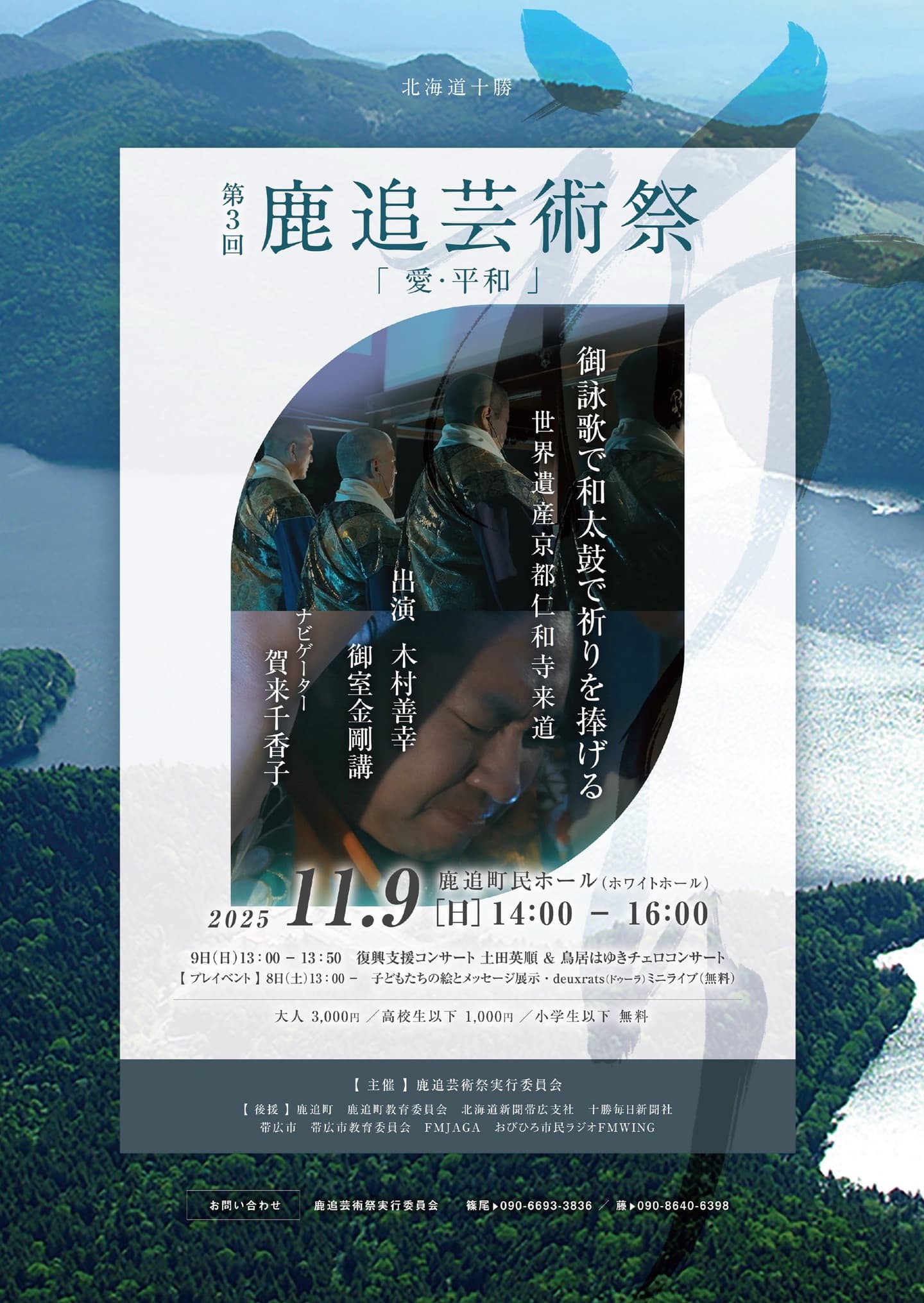 | タイトル | 第3回 鹿追芸術祭「愛・平和」 御詠歌で和大太鼓で祈りを捧げる世界遺産京都仁和寺来道 |